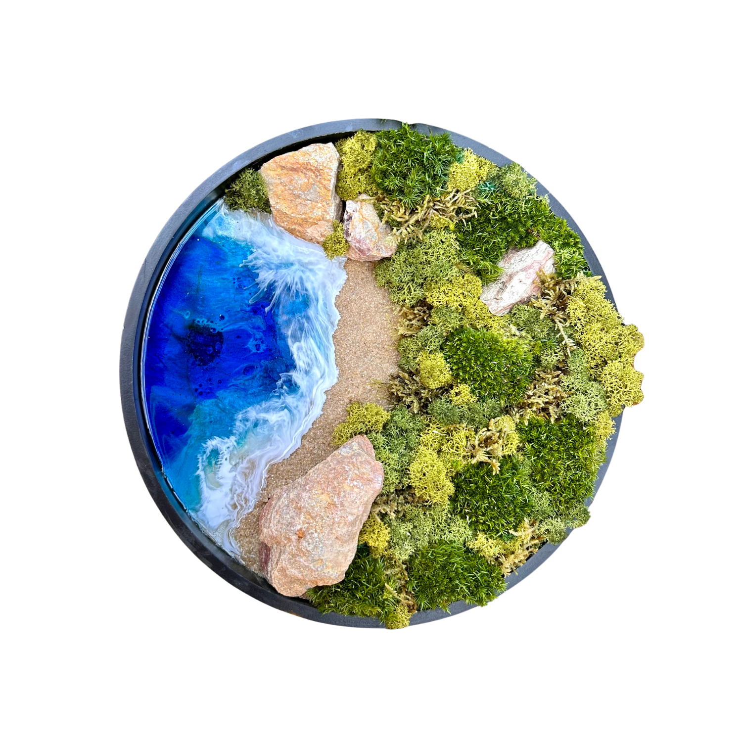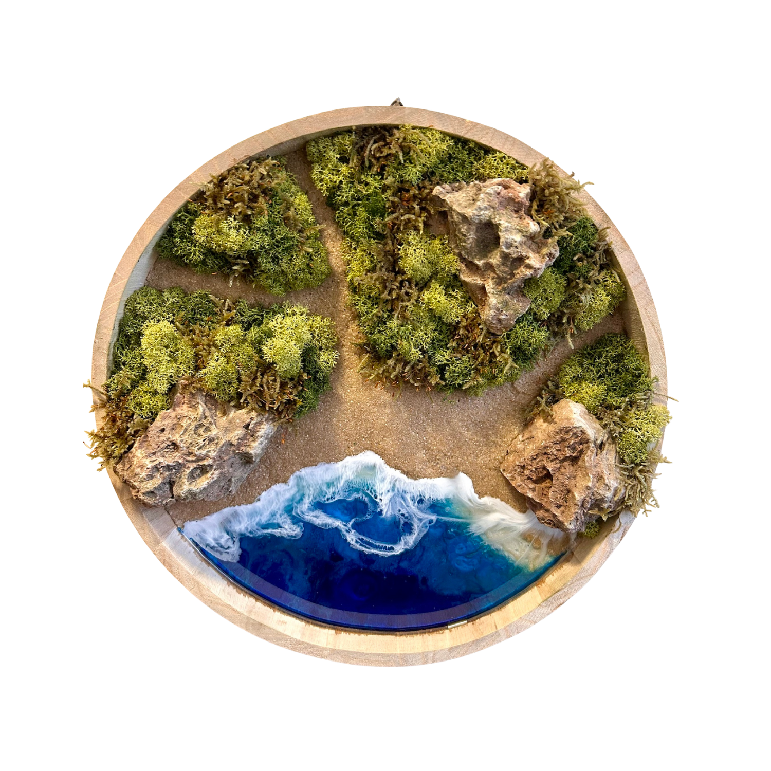 Echtes, konserviertes Moos, echter Sand, Natursteine, Treibholz, ein Meer mit wilden Wellen, gegossen aus Resin.